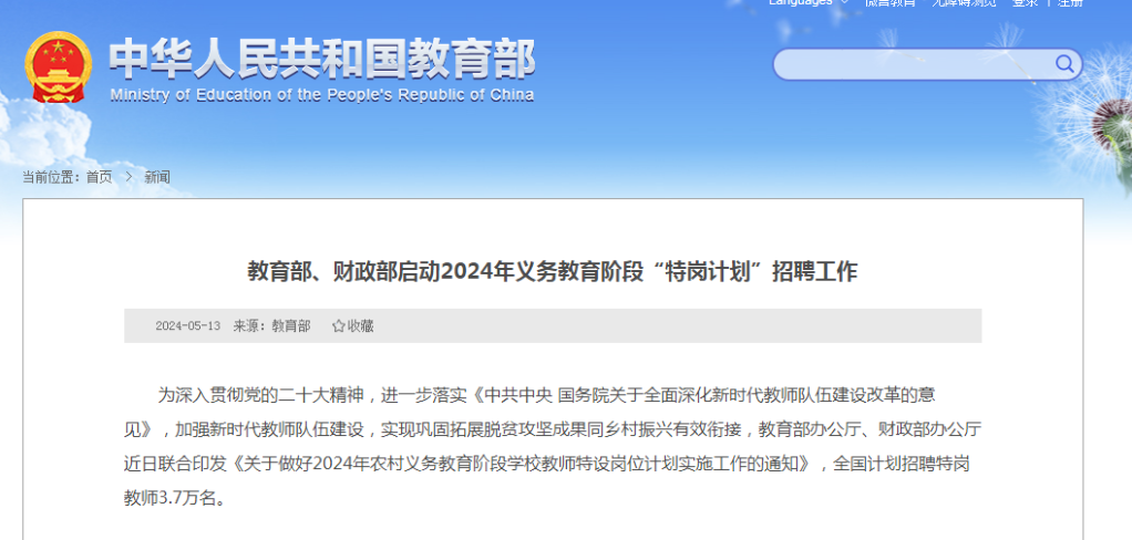 记者5月13日从教育部获悉,教育部办公厅、财政部办公厅近日联合印发通知,就做好2024年农村义务教育阶段学校教师特设岗位计划实施工作进行部署。根据通知,2024年全国计划招聘“特岗计划”教师37000名。