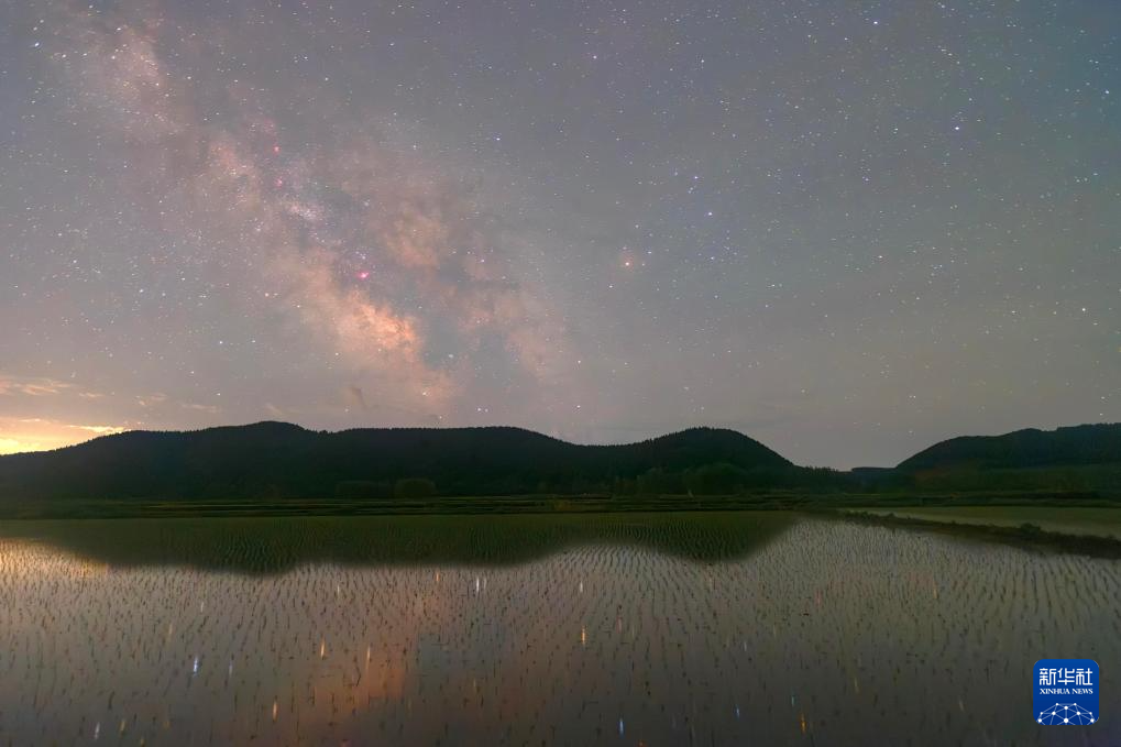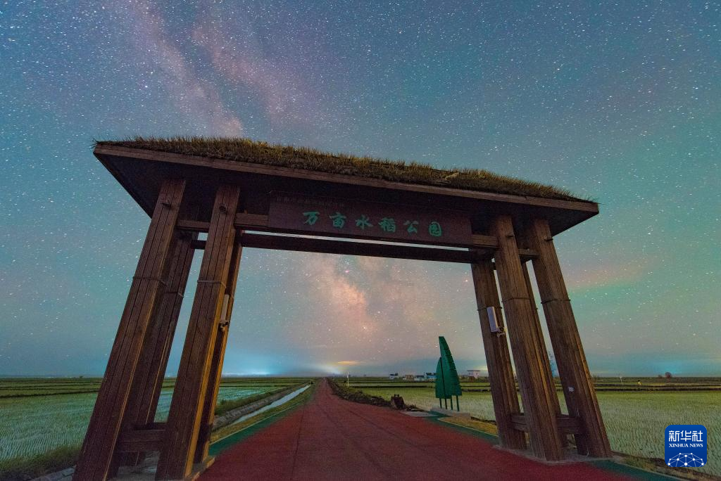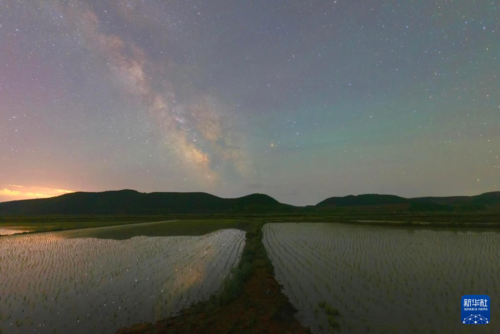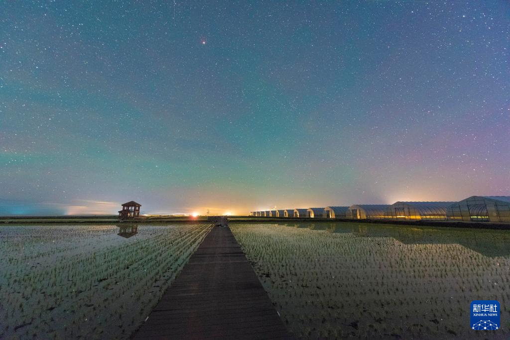 这是星空下的黑龙江省佳木斯富锦市万亩水稻公园(6月1日摄)。