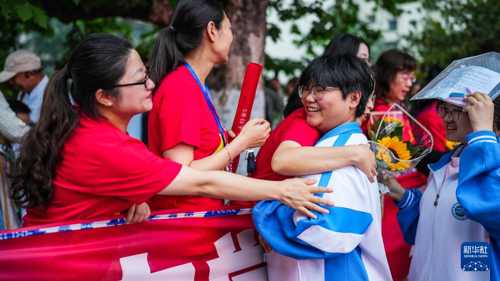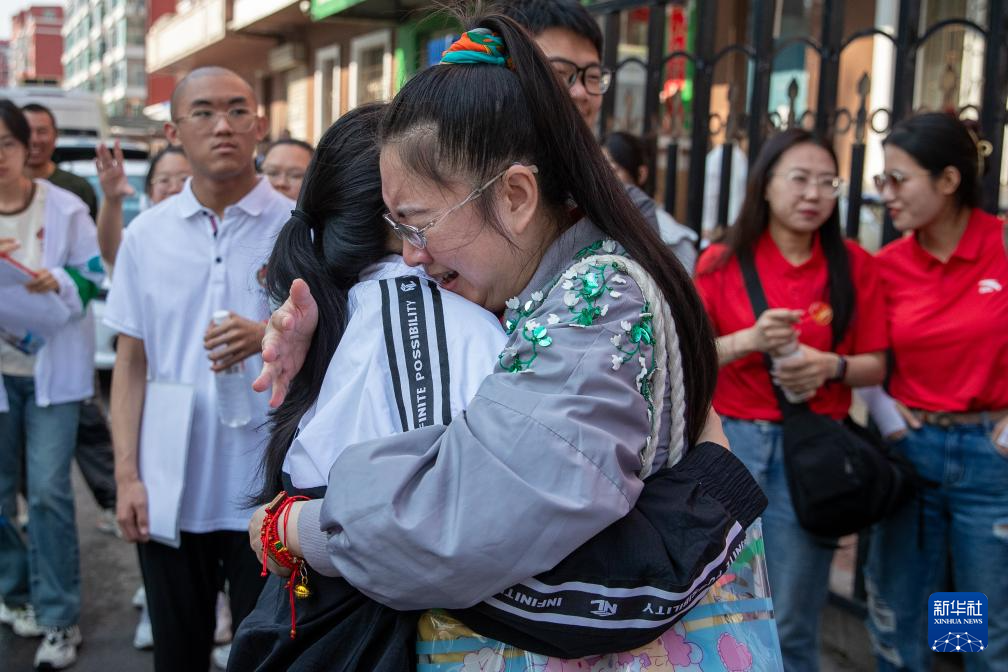 6月7日,在黑龙江哈尔滨市第七十二中学考点,一名来自哈尔滨市第十二中学的老师与考生拥抱。