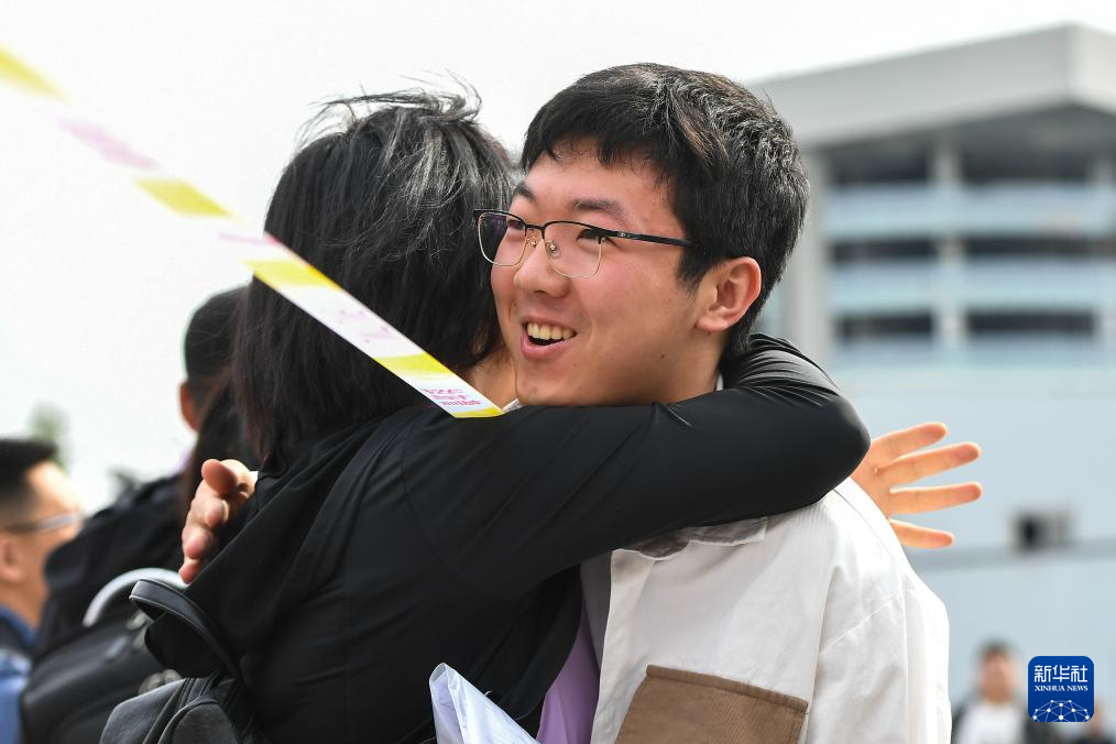 6月7日,考生在贵州贵阳市乌当中学考点和送考老师拥抱。