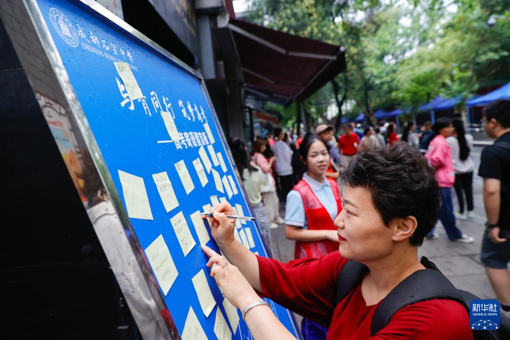 6月7日,在四川省成都石室中学(文庙校区)考点外,一名考生家长在高考寄语留言板上为考生留言加油。