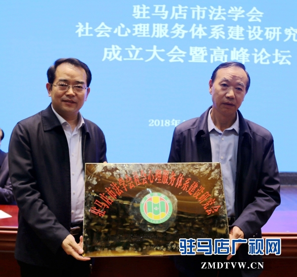 【驻马店市广视融媒讯】(记者 武帅)为积极探索推进社会心理服务体系建设工作,全力实施“心理安防工程”,切实提升广大市民的安全感和幸福感,推动形成崇德向善、循法而为的良好社会氛围。4月18日上午,驻马店市法学会社会心理服务体系建设研究会成立大会暨高峰论坛举行。市委常委、政法委书记、市法学会会长孙巍峰出席成立大会并为市法学会社会心理服务体系建设研究会授牌。