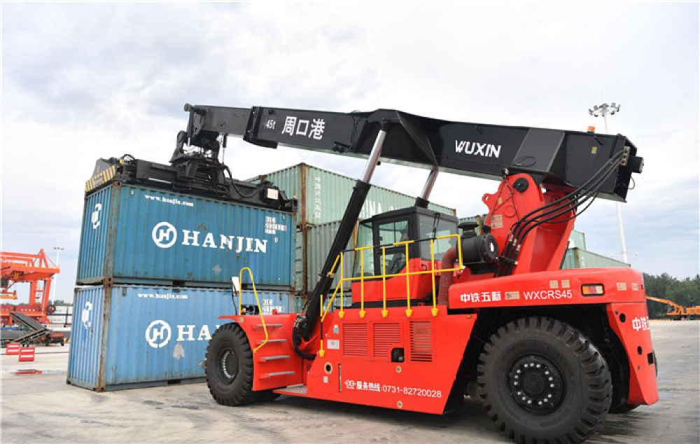 工人在周口中心港码头搬运集装箱(7月31日摄)。新华社记者 李嘉南 摄