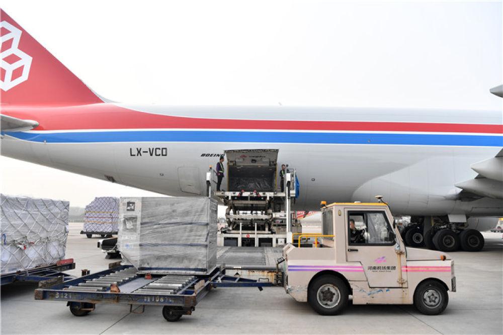 郑州新郑国际机场工作人员为卢森堡国际货运航空公司货机卸货(11月7日摄)。新华社记者 李嘉南 摄