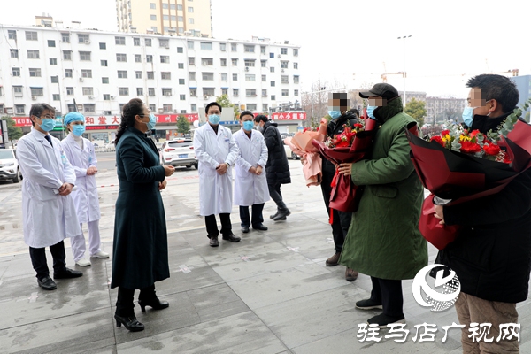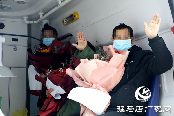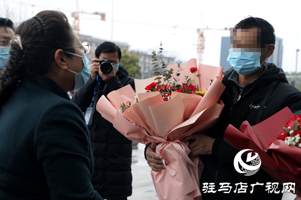 驻马店市卫健体委党组书记、主任李桂霞为3名患者送上鲜花和祝福。患者对医院的精心治疗表示感谢,并向医务人员深深鞠躬。