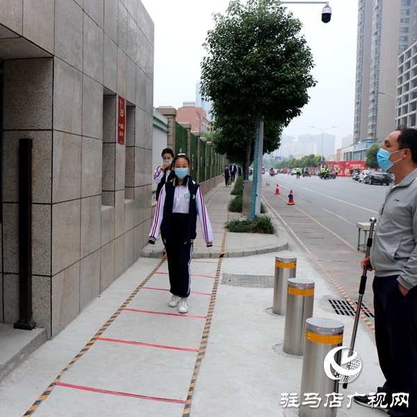 在驻马店市第二初级中学(北区)门口,学生们依次沿标识线指示入校。