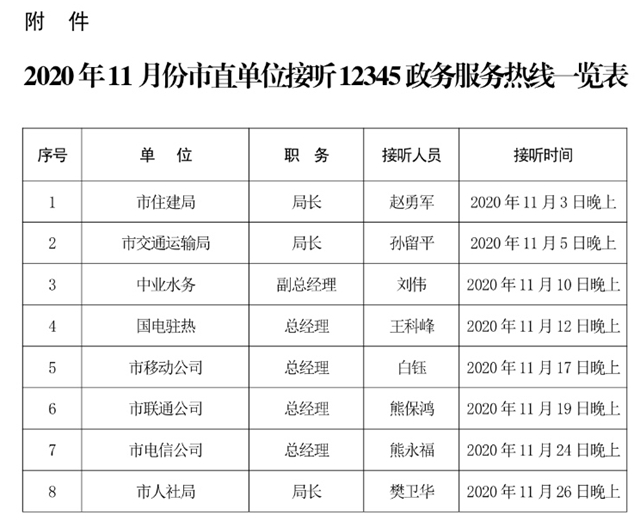 为持续贯彻落实“以人民为中心”的发展理念,把人民群众普遍关心关注的热点难点问题解决好、维护好,按照工作安排,2020年11月驻马店市政府将继续开展市直单位现场接听市12345热线电话活动。