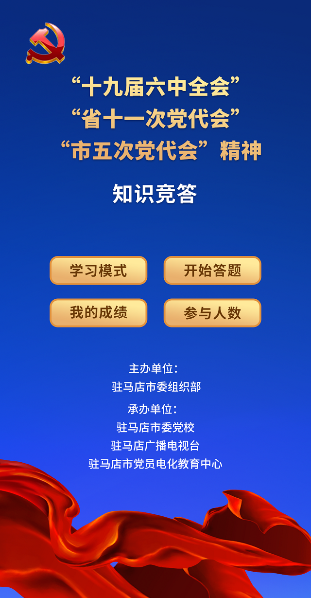 11月25日,记者从驻马店市委组织部获悉,为进一步深入学习贯彻十九届六中全会、河南省十一次党代会和驻马店市五次党代会精神,推动党员干部学实学透,市委组织部决定开展十九届六中全会和省十一次党代会、市五次党代会精神线上知识竞答主题活动。