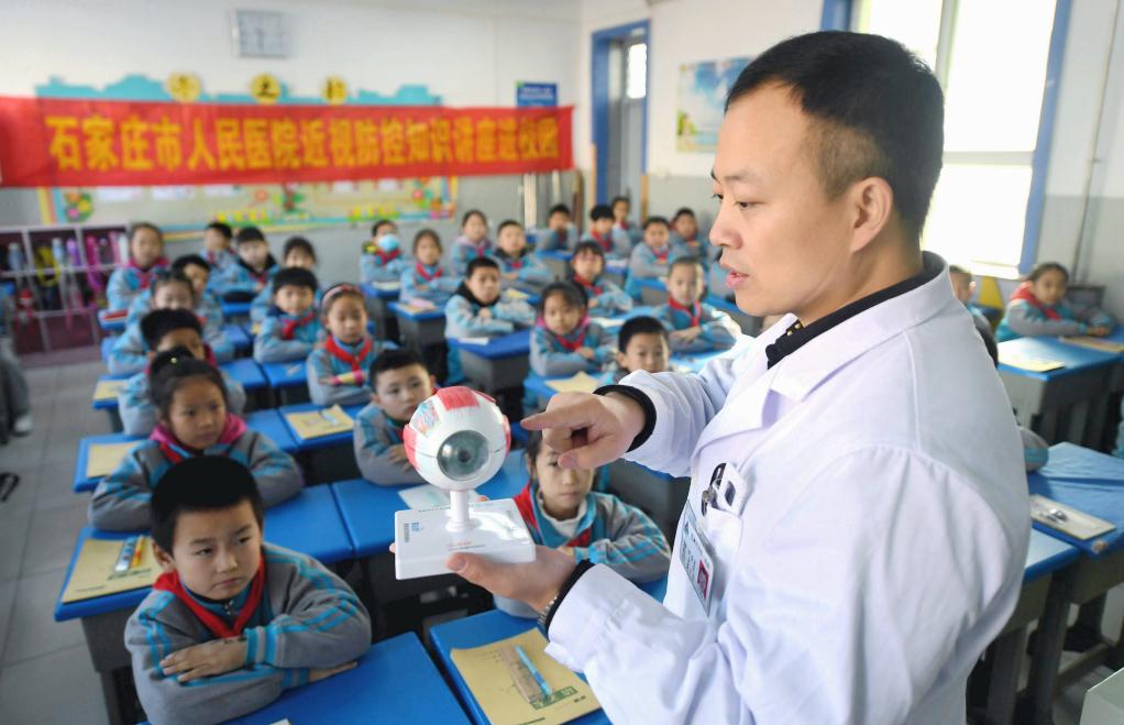 2020年12月4日,在石家庄市槐安西路小学,医务人员给学生们讲解眼睛的构造。新华社记者 王晓 摄