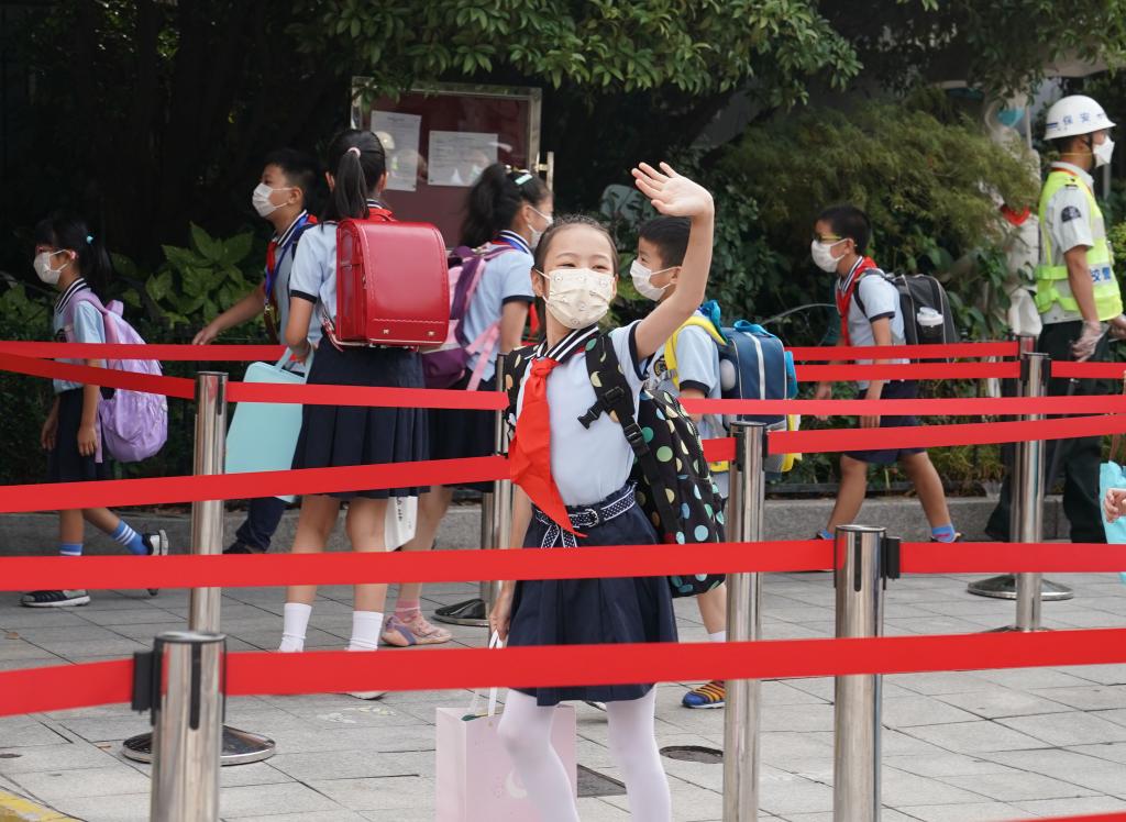 9月1日,上海约165万名中小学生迎来开学日。在上海市第一师范学校附属小学,记者看到,在校门口完成排队测温、手部消毒后,学生们很快就能进入自己的教室。
