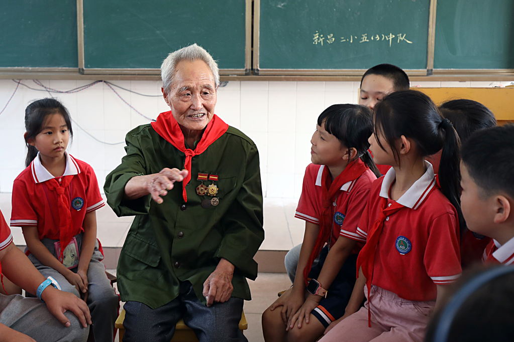 9月1日,94岁的“一等功臣”、退役老兵陈学成在江西省宜丰县新昌二小五年级(3)班讲述革命故事。(受访者供图)