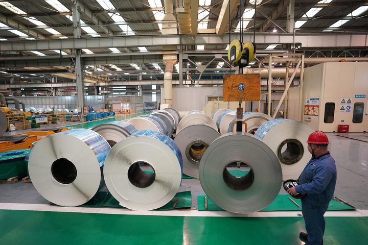 车间内,生产线上机器轰鸣,一卷卷薄如蝉翼、光滑如镜的钢材经过压延、清洗、包装等步骤自动化制成。