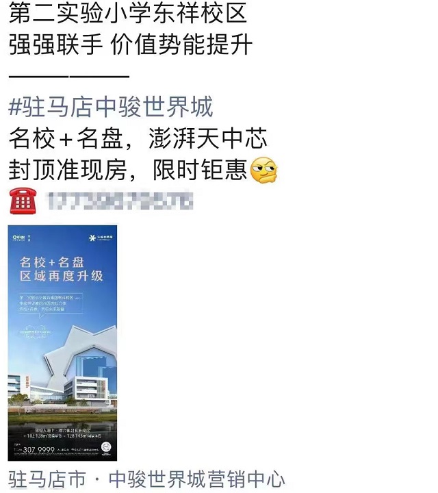 近日,驻马店市多个购房者向记者反映,位于雪松大道与前进路交会处的中骏世界城项目,宣传“买房上第二实验小学东祥校区”,涉嫌虚假宣传。