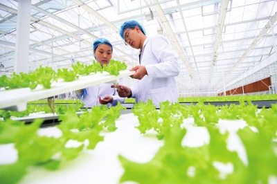 ①智慧农业示范园内技术人员查看育苗生长情况。