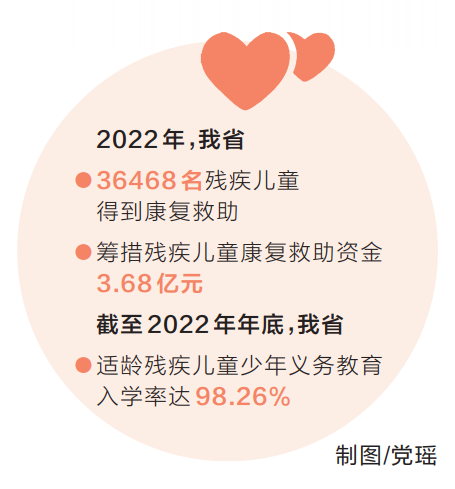 康复和教育都是残疾儿童的基本需求。省教育厅总督学刘林亚介绍,目前我省基本形成以普通学校随班就读为主体、特教学校为骨干、送教上门和远程教育为补充的特殊教育体系。截至2022年年底,在校残疾学生8.22万人;适龄残疾儿童少年义务教育入学率达98.26%,高于全国平均水平。