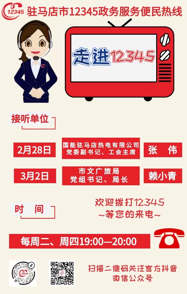 按照《驻马店市人民政府办公室关于建立市直单位现场接听12345热线电话制度的通知》(驻政办明电〔2019〕103号)、《驻马店市12345政务服务便民热线中心关于2023年2月份市直单位、中心城区区直单位及乡镇(街道)现场接听12345热线电话的通知》(驻热线文〔2023〕2号)相关要求,2月28日,国能驻马店热电有限公司党委副书记、工会主席张伟;3月2日,市文广旅局党组书记、局长赖小青将现场接听12345热线电话,欢迎广大市民就相关问题进行来电。