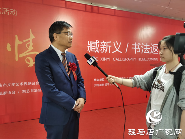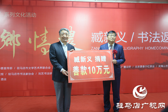 中共驻马店市委常委、宣传部长、副市长刘晓文在致辞中说,臧新义先生是驻马店人的骄傲,也是热爱家乡的楷模。多年来,他一直心系故乡、时刻关心着驻马店文艺事业的发展。本次返乡展不仅展出了他近年来精心创作的90余件作品,还无偿把部分作品捐献给家乡,捐献给杨靖宇将军纪念馆,竹沟革命纪念馆,驻马店市文化馆,以及驻马店职业技术学院等相关单位,并向驻马店市慈善总会捐赠人民币十万元,专项用于驻马店市残疾人事业,既让我们充分领略到了臧新义先生高超的艺术水准,也深刻感受到了其对家乡的一往深情和博大胸怀。