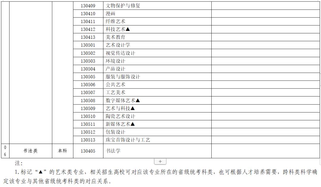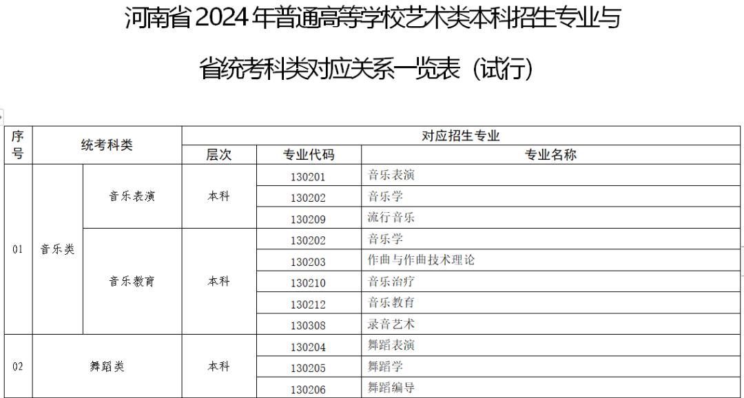河南省2024年普通高等学校艺术类本科招生专业与省统考科类对应关系一览表(试行)