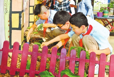 校园一隅,郑州市郑东新区龙腾小学一年级的孩子开辟了“一方菜园子”。科学课上,他们一起探究植物生长的奥秘,观察小苗的长势;美术课上,拿起画笔描绘植物生长的过程;劳动课上,在老师的带领下,收割“一方菜园子”的蔬菜,体验丰收的快乐……