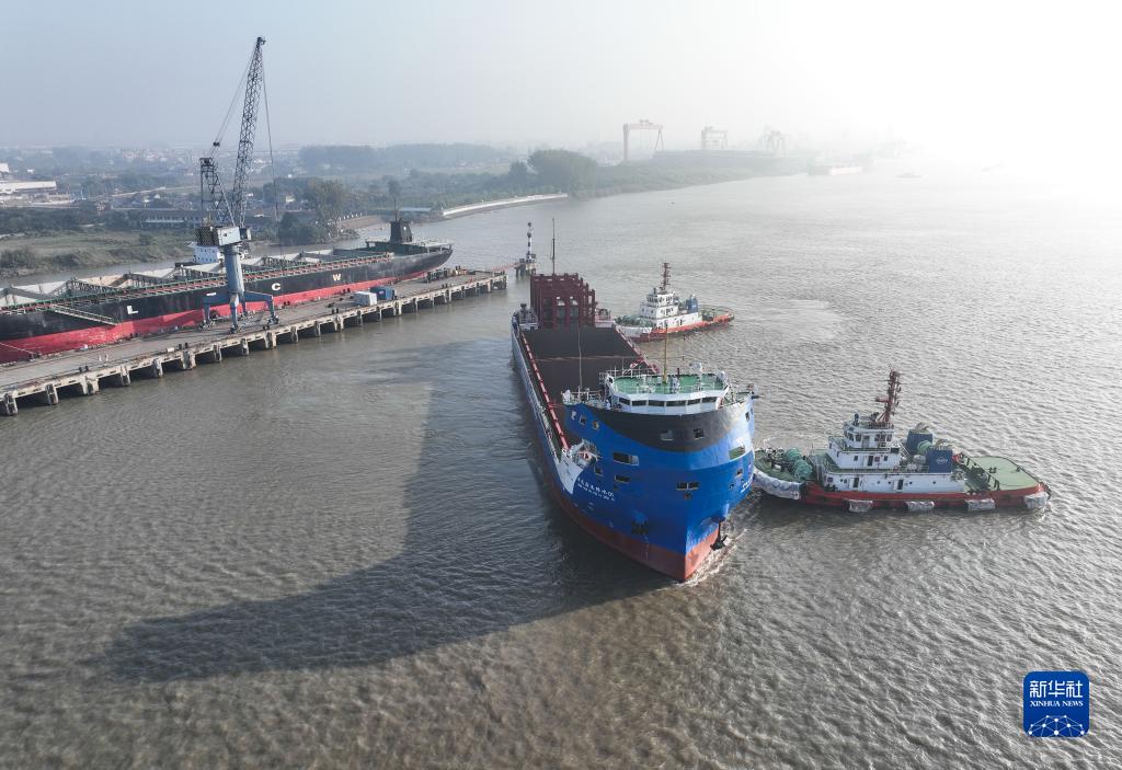 10月18日,中远海运万吨级电动集装箱船离开码头准备试航(无人机照片)。