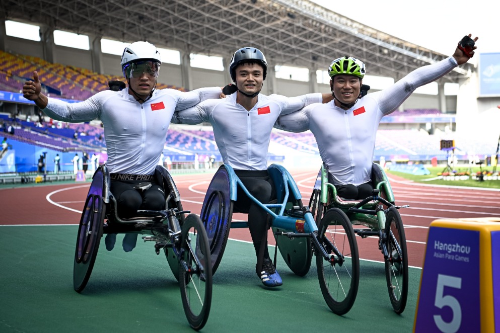 10月24日,中国选手代云强(右)、马卓(左)与胡洋在男子1500米T54级决赛后合影。新华社记者江汉摄
