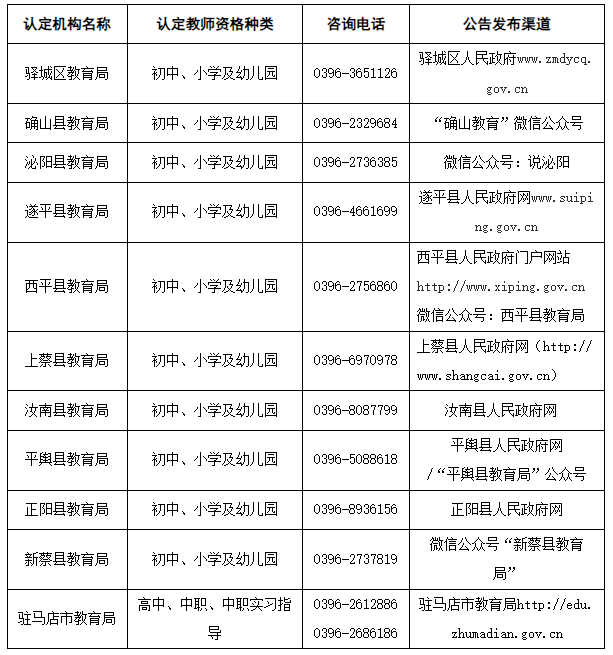 驻马店市教师资格认定机构信息一览表