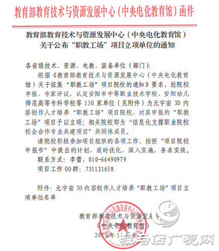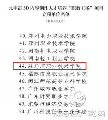 2023年11月8日,教育部教育技术与资源发展中心公布了元宇宙3D内容创作人才培养“职教工场”项目立项单位名单,驻马店职业技术学院信息工程学院申报项目获批立项。驻马店职业技术学院被成功认定为元宇宙3D内容创作人才培养“职教工场”项目院校,同时驻马店职业技术学院也成为“信息化支撑职业院校校企合作专业共建项目”共同体成员。