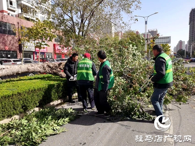 16日上午,顶着7、8级的阵风,记者来到市区慎阳路与文明路交叉口,看到东侧一边的绿化带内,一颗大树被大风从根部刮断,倒伏的树木占居了右侧车道,市园林绿化中心专业人员手拿电锯,正在将倒伏的树木锯成段,随后他们把锯完的树木进行清理、运走,现场安全隐患得到了及时消除。