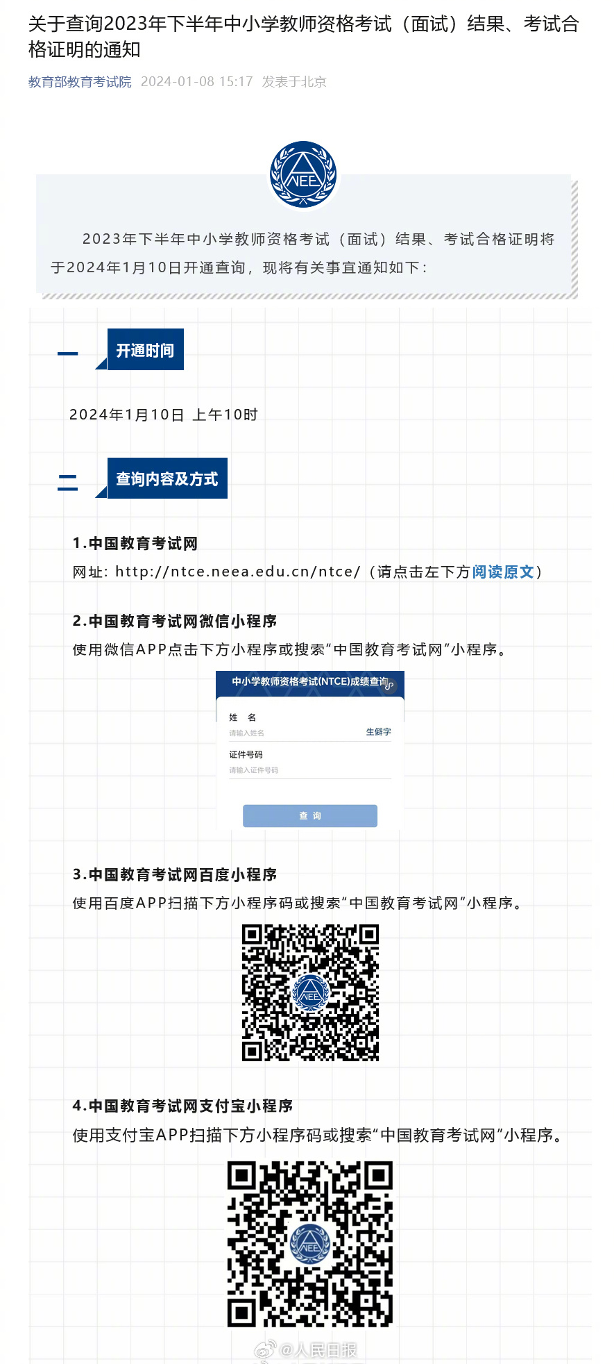 据教育部教育考试院消息,2023年下半年中小学教师资格考试(面试)结果、考试合格证明将于2024年1月10日开通查询。考生可通过如下4种渠道查询↓↓↓