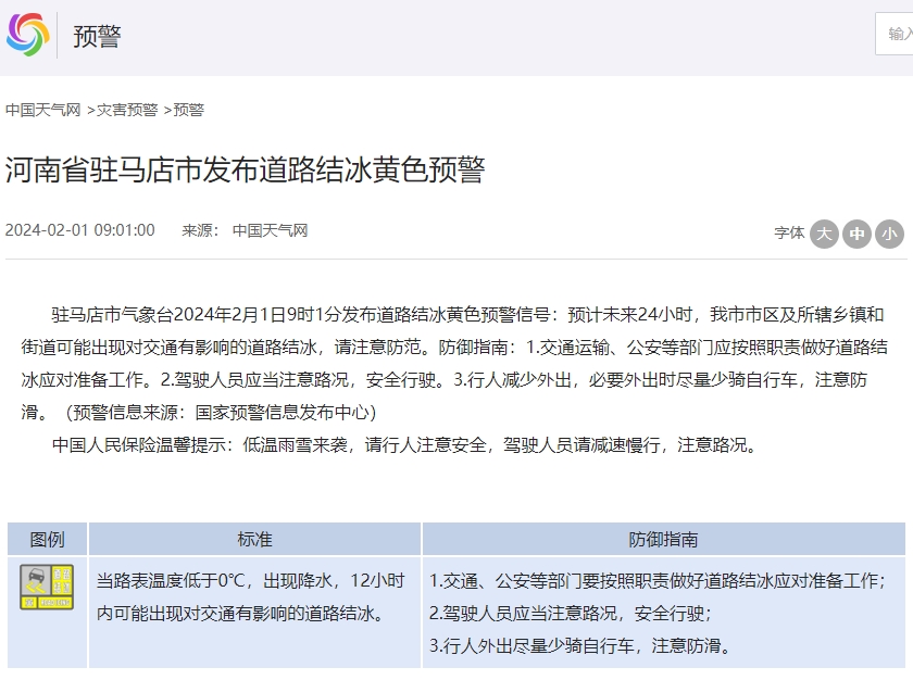 驻马店市气象台2024年2月1日9时1分发布道路结冰黄色预警信号:预计未来24小时,我市市区及所辖乡镇和街道可能出现对交通有影响的道路结冰,请注意防范。