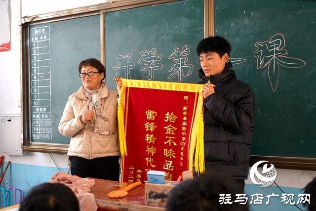 “我们要学习程梦豪拾金不昧的精神。”2月26日,寒假开学第一日,新蔡县实验中学808班班主任杜老师手持一面写有“拾金不昧品德高 雷锋精神代代传”的锦旗,为全班同学上了一堂“特殊”的“开学第一课”,这堂课没有备课,讲台下掌声雷动、气氛热烈,因为课程的主人公,就是本班在寒假期间捡到9.8万元现金并归还失主的程梦豪同学。