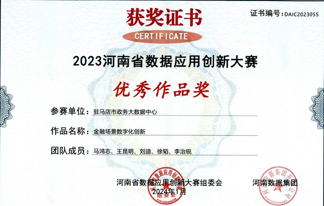本次大赛吸引了众多优秀团队和企业参与,竞争异常激烈。共有来自省内外316名选手组成的118支团队报名参赛,收集作品111份。驻马店市政务大数据中心选送的参赛项目《金融场景数字化创新》荣获优秀作品奖。