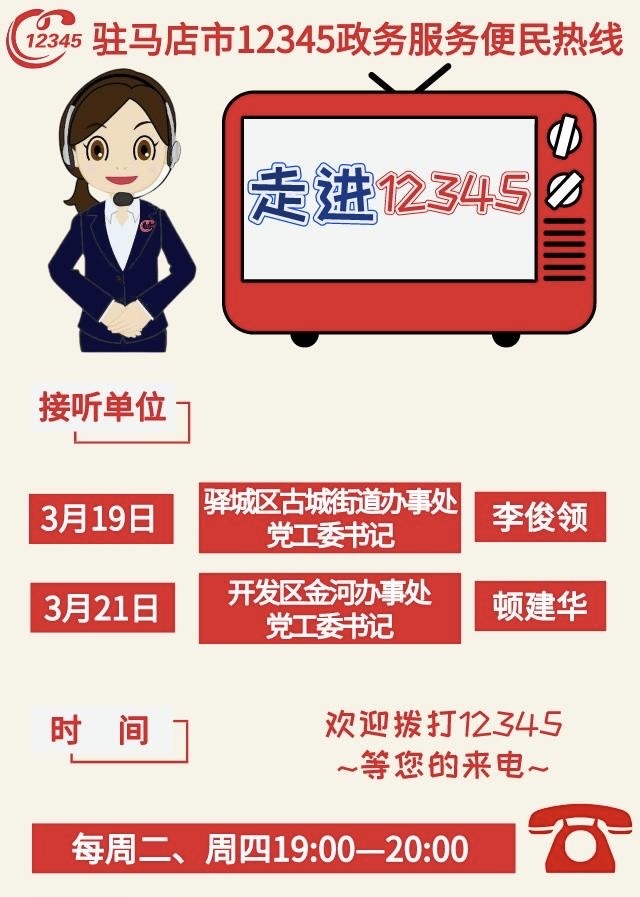 据了解,按照《驻马店市人民政府办公室关于建立市直单位现场接听12345热线电话制度的通知》、《驻马店市12345政务服务便民热线中心关于2024年3月份市直单位、中心城区区直单位及乡镇(街道)现场接听12345热线电话的通知》相关要求,3月19日晚上,驿城区古城街道办事处党工委书记李俊领;3月21日晚上,开发区金河办事处党工委书记顿建华现场接听12345热线电话,欢迎广大市民就相关问题进行来电。(编辑 詹云清)