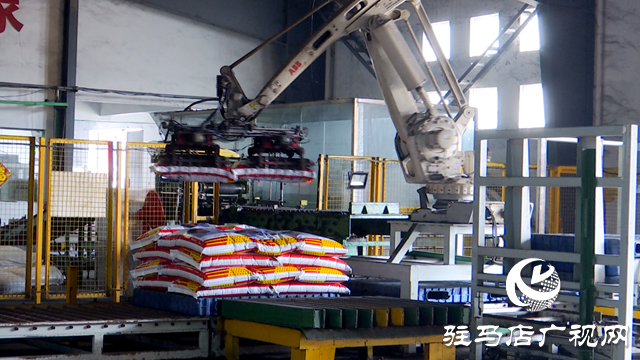 包装车间已实现了全自动化生产,提袋、充肥、封包一气呵成,一袋袋复合肥包装完毕后通过生产线输送到码垛车间,由机械臂进行自动码垛,安全快捷,效率很高。码垛完成后,工人们用叉车再把化肥转移到储备仓库。