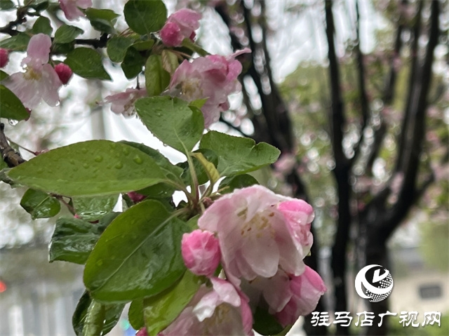 3月23日,驻马店市区开源路旁的海棠花竞相绽放,在春雨的滋养下,显得那么娇嫩,滴滴细雨轻轻地打在花瓣上,仿佛是为海棠花增抹色彩,宛如披上轻纱的仙子在微风中翩翩起舞。
