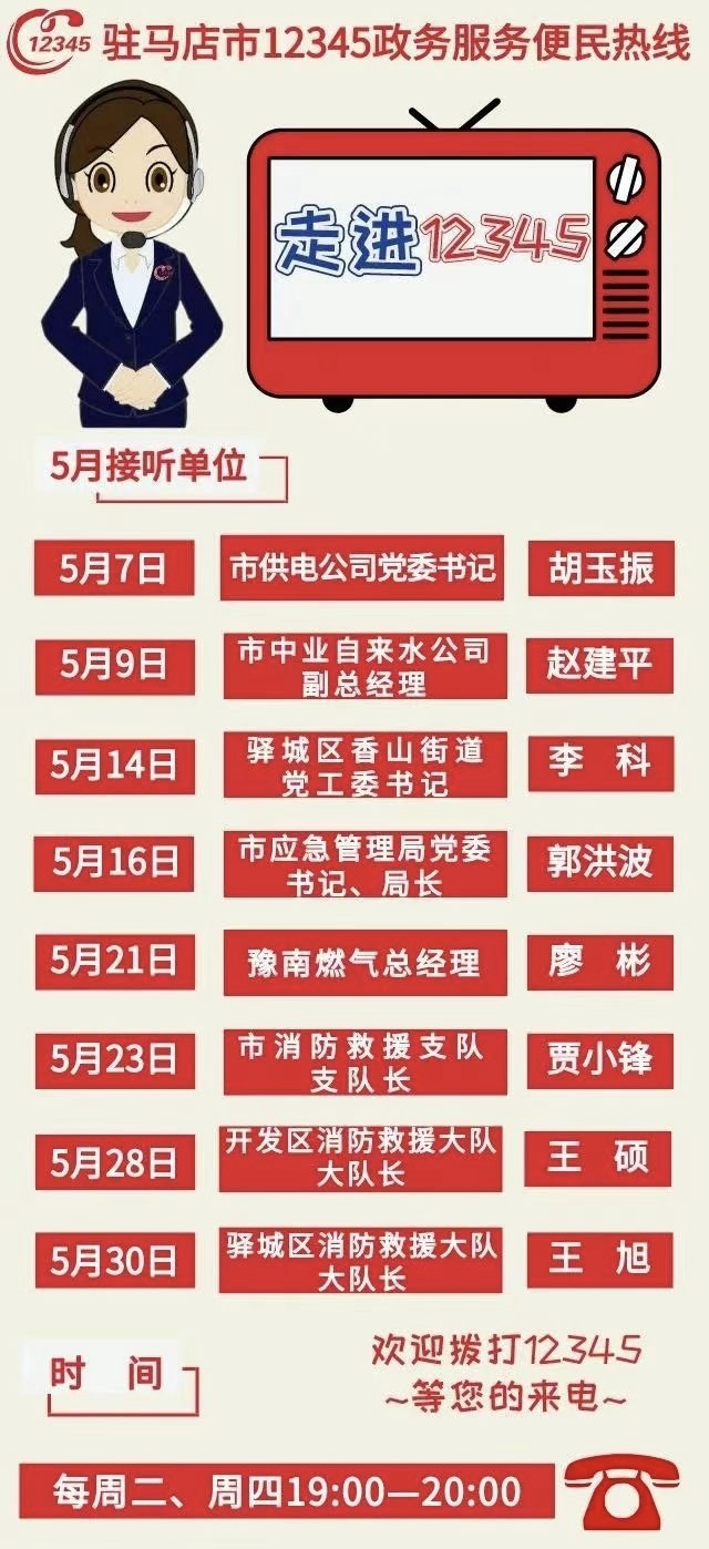 按照《驻马店市人民政府办公室关于建立市直单位现场接听12345热线电话制度的通知》(驻政办明电〔2019〕103号)、《驻马店市12345政务服务便民热线中心关于2024年5月份市直单位、中心城区区直单位及乡镇(街道)现场接听12345热线电话的通知》(驻热线文〔2024〕4号)相关要求,5月份以下单位将参与12345热线接听活动,欢迎广大市民就相关问题进行来电。
