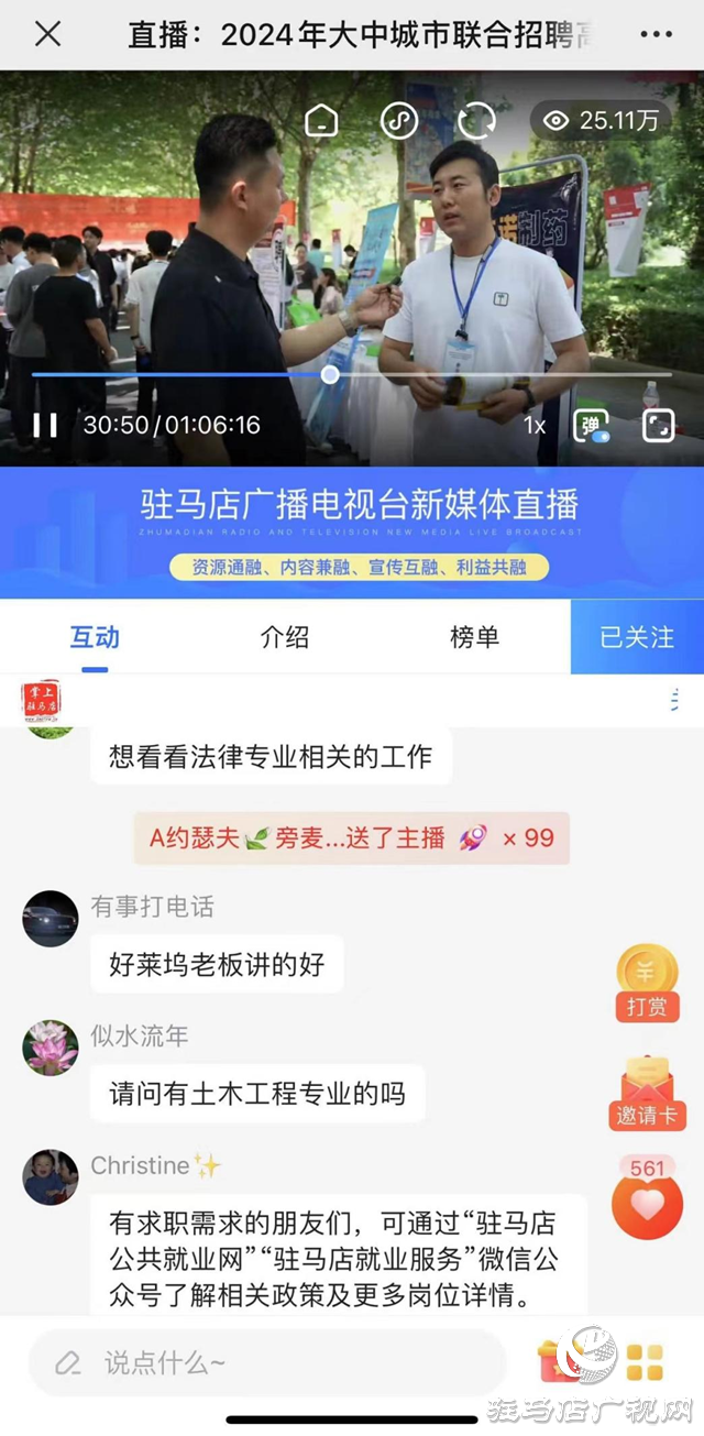 当日,黄淮学院春季双选会采用“现场招聘+直播带岗”的方式,通过驻马店广播电视台广视网云直播、“掌上驻马店”微信公众号、视频号、抖音号同步直播,线上直播观看量达25万+。