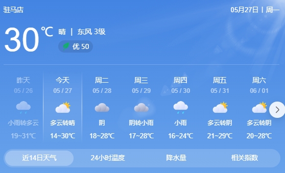 31日至6月2日,多云转晴天,气温19到32摄氏度