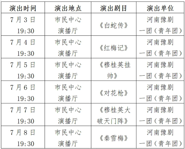 为传承优秀传统文化,满足人民群众高品质精神文化需求,根据省委宣传部安排,河南豫剧一团(青年团)将于7月3日至8日在驻马店市民中心演播厅演出6场经典剧目,戏迷朋友们可前往观看。