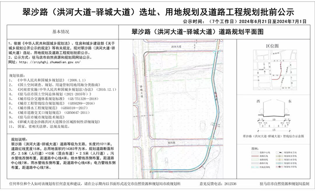 翠沙路(洪河大道—驿城大道),全长约为1011米,道路红线宽度为15米,总用地面积约14383平方米。
