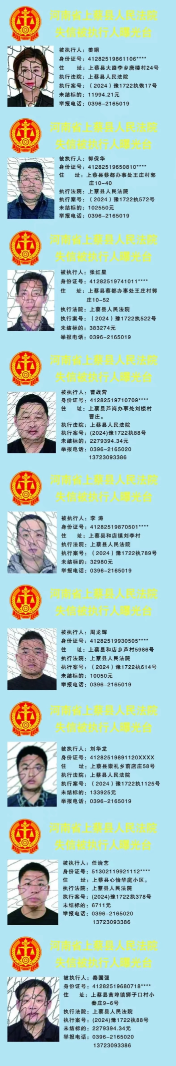 近日,驻马店市中级人民法院公布了9名失信被执行人名单,督促他们尽快履行法律义务!