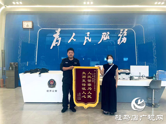 6月29日上午10时,辖区群众魏女士携两面写有“尽职尽责、为民服务”和“人民警察为人民、失而复得暖人心”的锦旗来到驻马店市公安局经济开发区分局体育中心警务站,见到警务站的民辅警,魏女士激动地握着民辅警的手表达感谢:“本来我们都不抱希望了,没想到警察同志竟然帮我们找到了丢失的物品,真是太感谢了”。