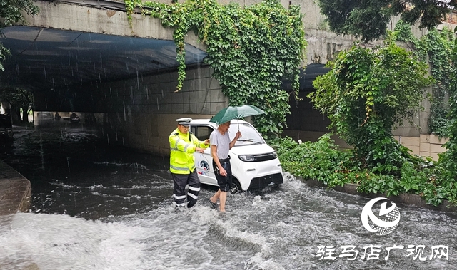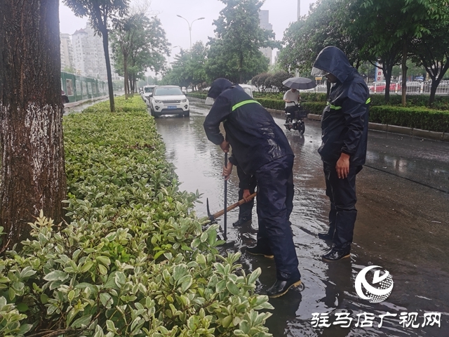 此次暴雨具有来势快、雨量大等特点。暴雨导致中心城区部分路段短时间内积水严重。城管、交警等部门迅速出动,奔赴各积水点,争分夺秒疏通道路积水。9日上午9时,在置地大道天中山大道路口北侧,慢车道上积水严重,市政工程服务中心工作人员迅速赶来打开井盖排除积水。雪松大道北地下道积水较深,驿城区交警大队执勤交警在路口24小时守护,背着出行不便的市民通行。截至7月9日上午10点,中心城区所有道路积水点疏通,水排完,实现人员和车辆正常通行。