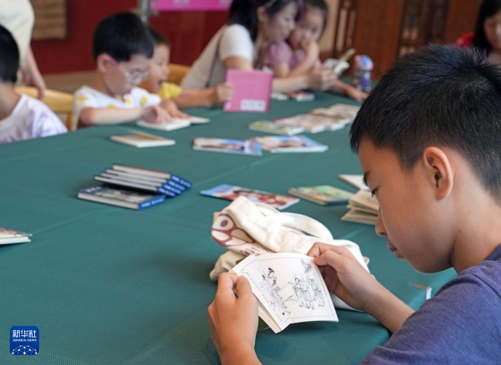 7月16日,在上海市群众艺术馆的“走进艺术之门”系列活动中,孩子们在阅读角看连环画。