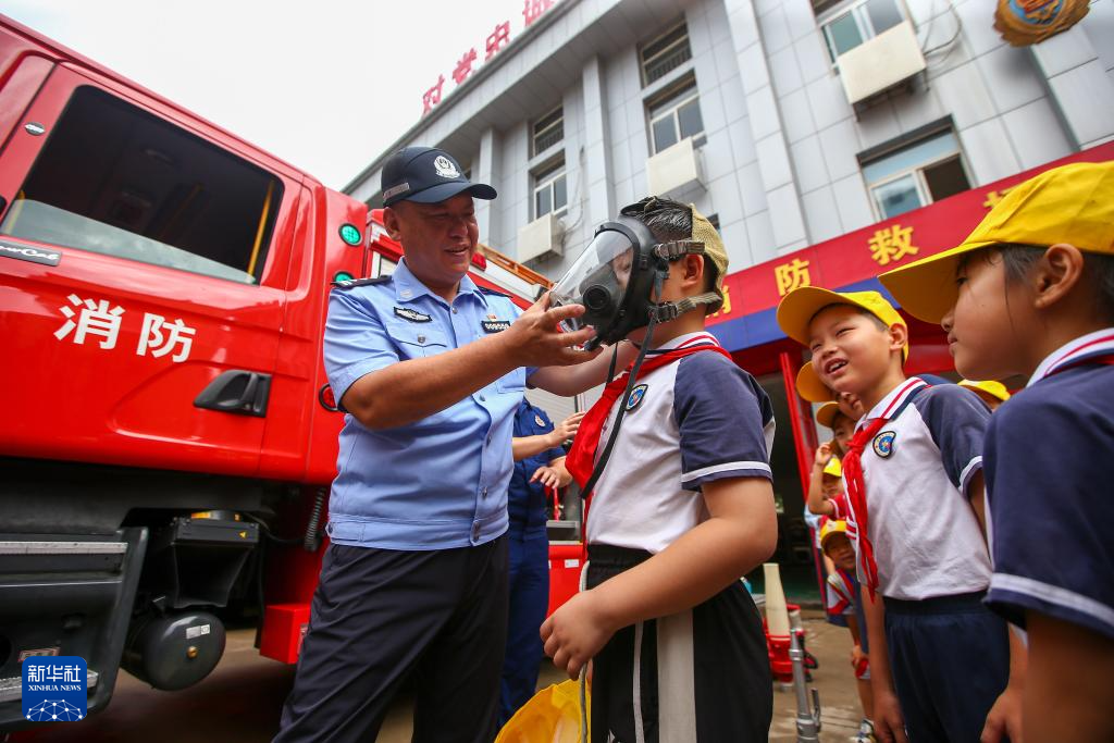 7月16日,在山东省济南市市中区英雄山路消防增援站,来自玉函小学的学生体验消防装备。