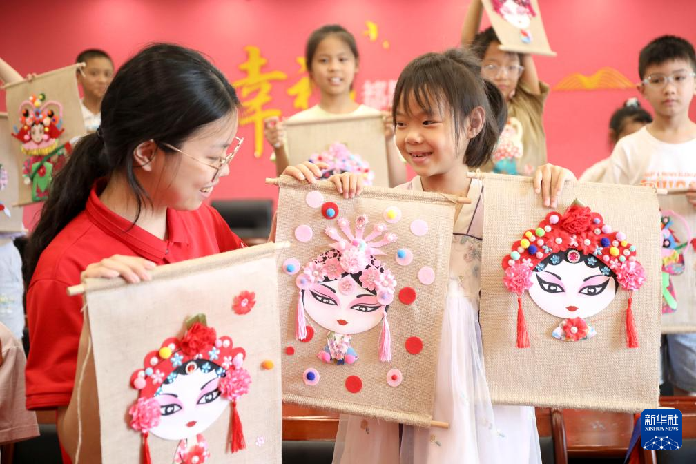 7月15日,在浙江省杭州市桐庐县凤川街道党群服务中心,志愿者和小朋友展示制作的脸谱挂画。