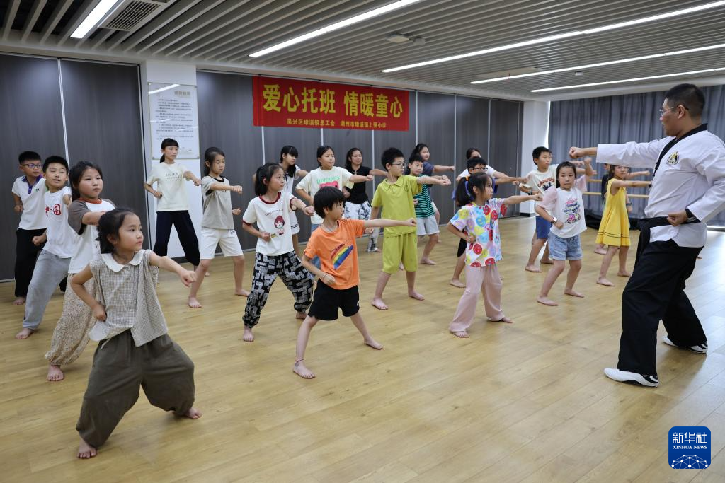 7月16日,在浙江省湖州市吴兴区埭溪镇总工会、上强小学、埭溪镇志愿者联合会举办的爱心暑托班上,公益讲师带领小朋友一起练习跆拳道。