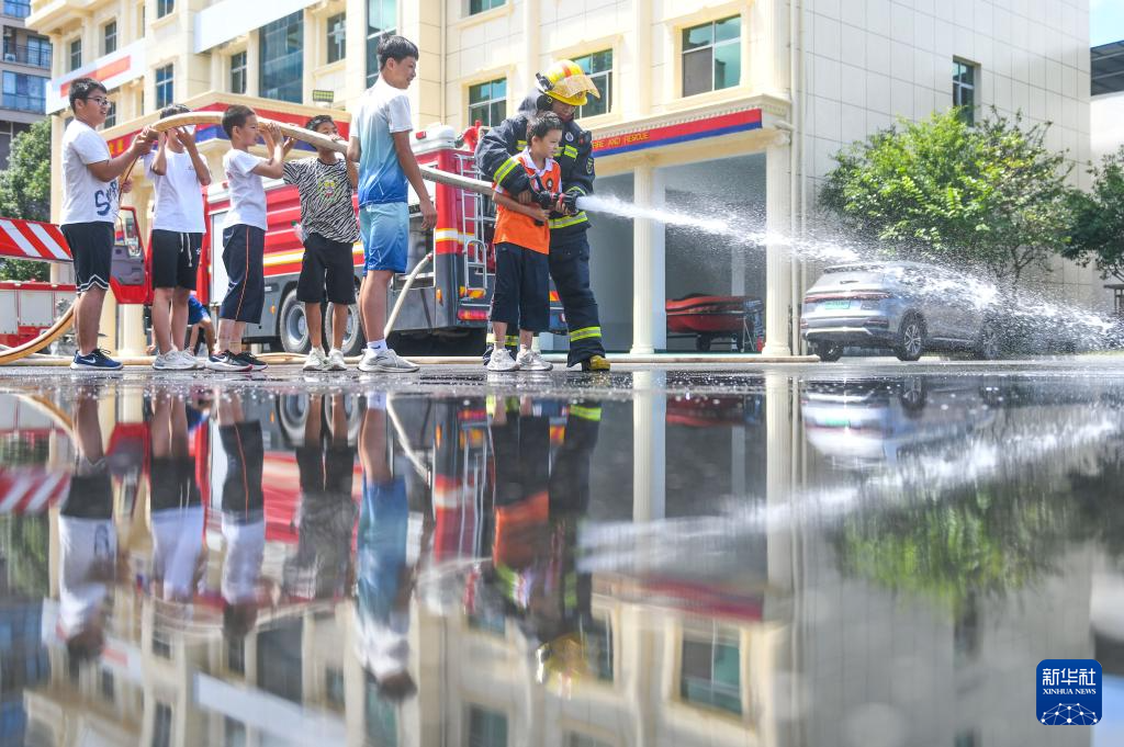 7月16日,在湖南省永州市道县道州北路消防救援站,小朋友在消防救援人员的辅导下体验使用消防水枪。