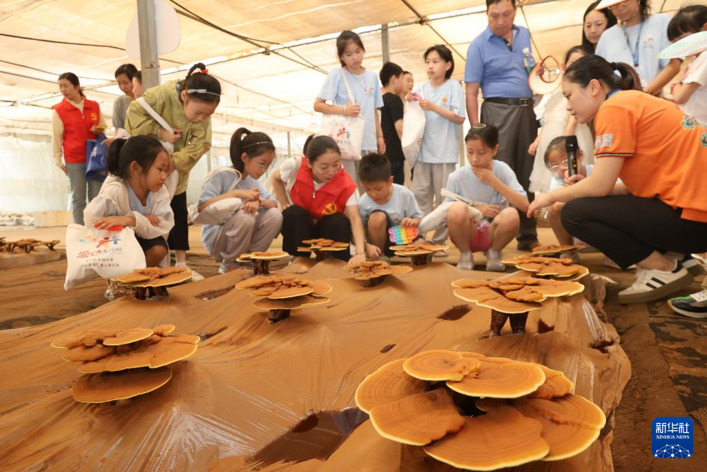 7月16日,江苏省南通市崇川区幸福街道“小候鸟”爱心暑托班学生在一家生物科技园的蕈菌园参观赤灵芝。