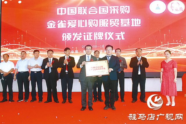 8月18日,中国联合国采购促进会金雀爱心购服贸基地颁发证牌仪式在河南金雀电子商务有限公司举行。中国联合国采购促进会会长王栩男为河南金雀电子商务有限公司授予“中国联合国采购促进会金雀爱心购服贸基地”牌匾。